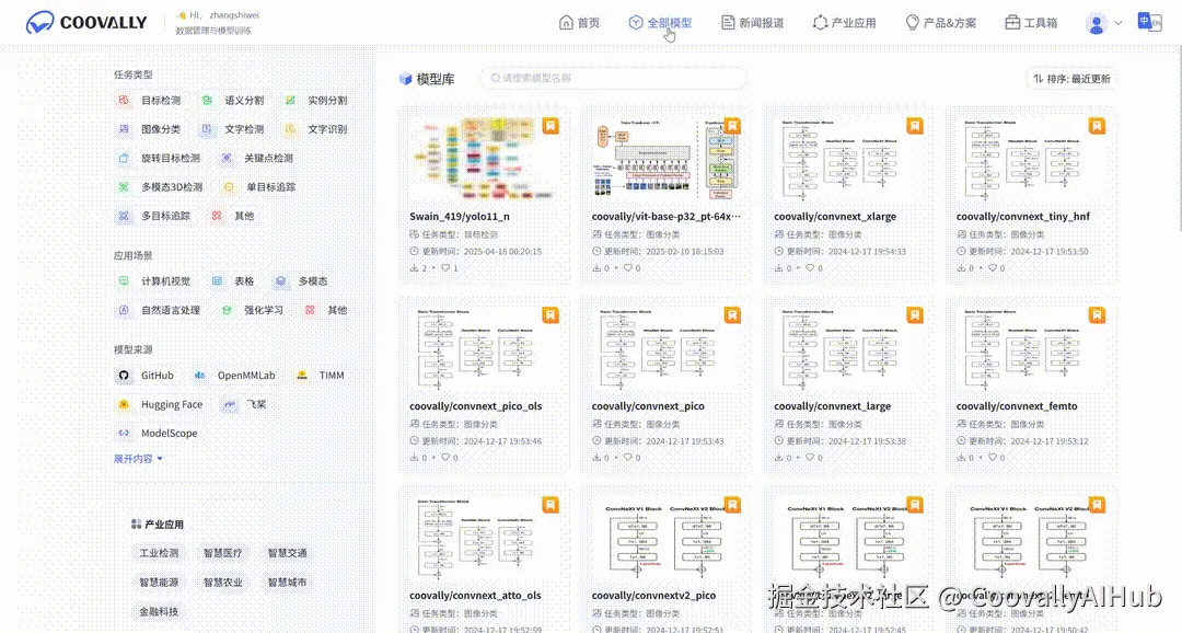 在Coovally平台上汇聚了国内外开源社区超1000+ 热门模型 ,覆盖YOLOv8、YOLOv10等 主流视觉算法。同时集成300+公开数据集 ,涵盖图像分类、目标检测、语义分割等场景,一键下载即可投入训练,彻底告别"找模型、配环境、改代码"的繁琐流程!