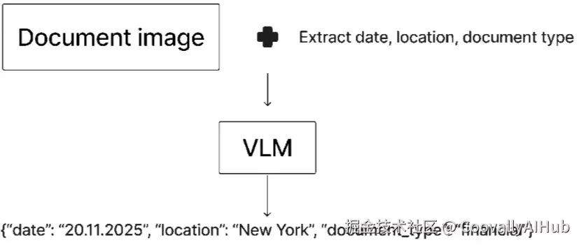 这张图展示了如何利用 VLM 执行信息提取。你再次向 VLM 提供文档图像,并提示它提取特定的数据点。在这张图中,我提示 VLM 提取文档的日期、文档中提及的地点以及文档类型。VLM 随后分析提示和文档图像,并输出一个包含所请求信息的 JSON 对象。