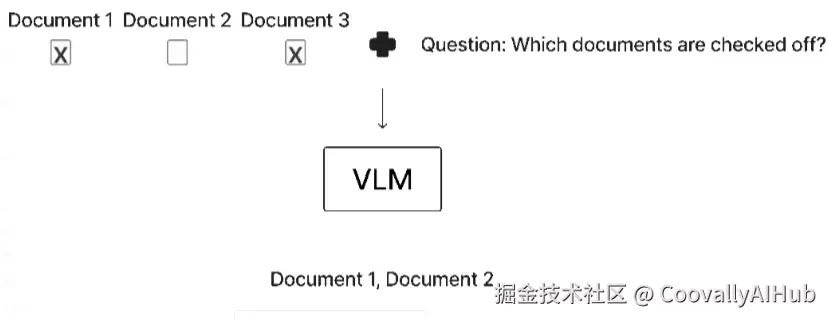 这张图展示了一个非常适合用 VLM 解决的问题。图片中包含关于文档的文本,以及复选框。你需要根据复选框的勾选状态来判断该包含哪些文档。如果只用大语言模型来解决这个问题会很困难,因为你首先需要对图像进行 OCR 识别。识别出来的文本会丢失其在图像中的视觉位置信息,而这个信息对于正确解决这个任务至关重要。使用 VLM,你既可以轻松读取文档中的文本,又能利用其视觉位置信息(比如文本是否位于已勾选的复选框上方),从而成功解决问题。