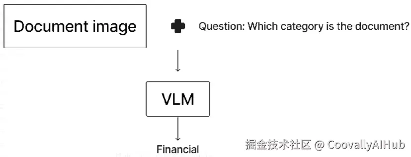 这张图说明了如何将 VLM 应用于分类任务。你向 VLM 提供文档图像和一个问题,要求它将文档分类到预定义的一组类别中。这些类别应包含在问题里,但图中因空间限制未显示。VLM 随后输出预测的分类标签。