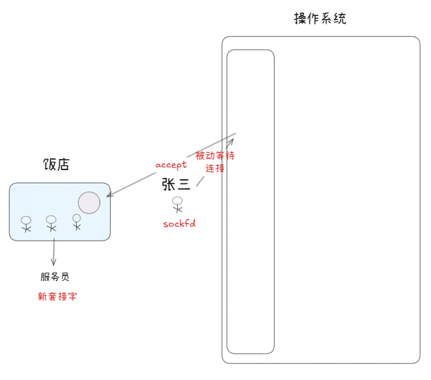 这就好比:张三是在饭店外拉客的前台人员,当路上有路人经过时他就开始拉客,张三就属于被动连接的套接字;当拉客这一行为(accept)成功时,就创建新的服务员(新套接字)为连接服务。总的来说,监听套接字sockfd是连接入口 ,而accept返回的fd是通信通道。