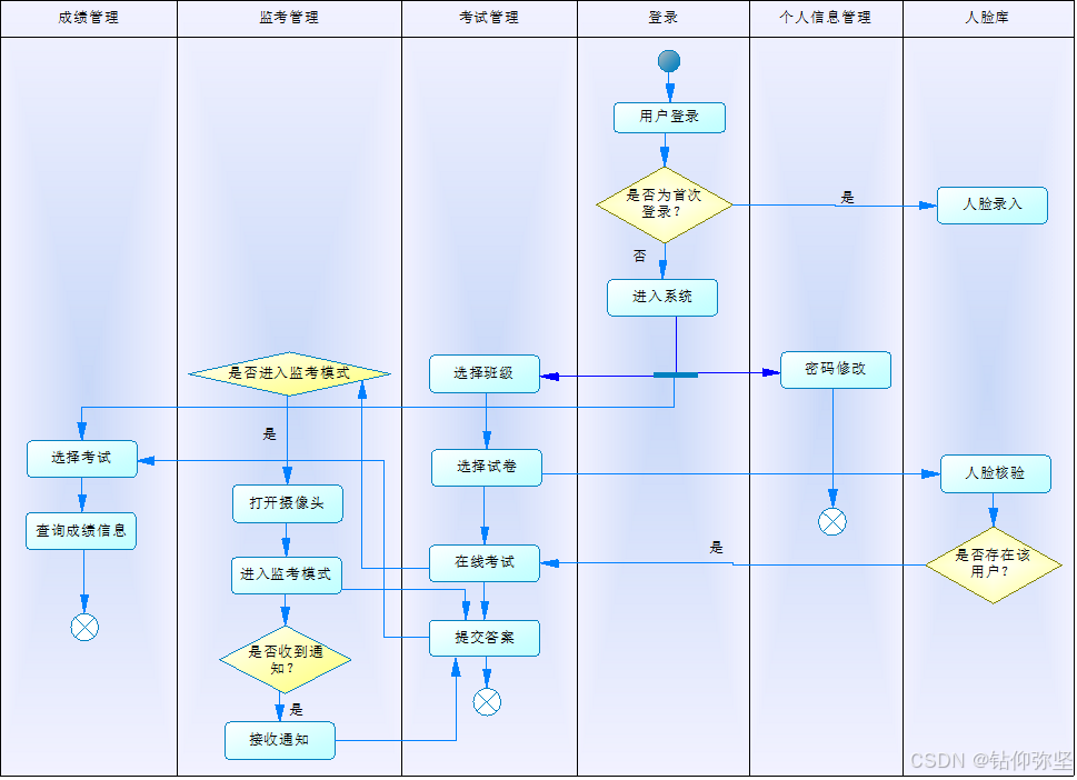 考生通过用户名和密码登录到在线考试系统,如果是首次登录,需要进行人脸身份录入。考生登录成功后可以选择要参加的考试,系统会生成相应的试卷。考生需要进行人脸核验,核验成功后进入考试页面。如果是监考模式,考生需要自行打开摄像头,系统将实时动态上传到云服务器供管理员监考。如果考生出现违规行为,可以接收到管理员的处理通知。考生可以正常填写答案并自行提交试卷,或者等待考试规定的时间自动提交。考生在考试完成后,等待管理员批阅后可以登录考试系统查询自己的分数。考生也可以修改自己的登录密码。活动图如图1.6所示。
