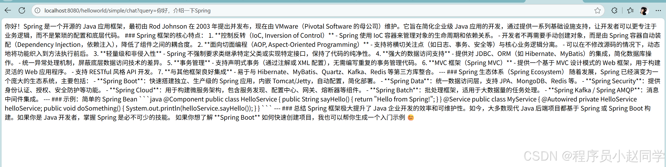 http://localhost:8080/helloworld/simple/chat?query=你好,介绍一下Spring