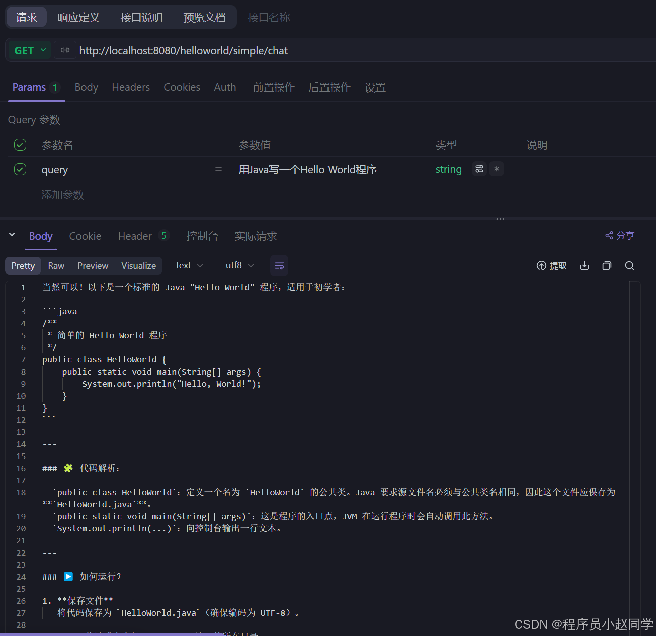 http://localhost:8080/helloworld/simple/chat?query=用Java写一个Hello World程序