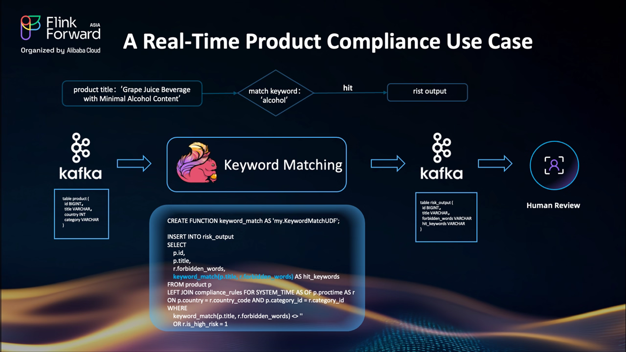 让我们通过一个具体的示例将所有内容整合在一起。以下是 Flink AI 函数如何解决我们的产品合规性挑战: