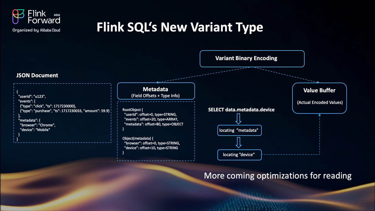 Flink 2.1 引入了新的VARIANT类型,这是一个原生的、二进制编码的半结构化类型。与普通的JSON字符串不同,VARIANT以结构化方式存储元数据和值。因此访问data.metadata.device只是一个直接的偏移查找,不再是完整的解析。