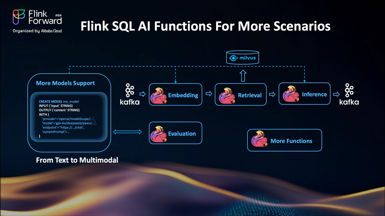 我们也在持续拓展 Flink SQL 的 AI 能力边界。除了现有的文本处理和嵌入函数,未来将支持: