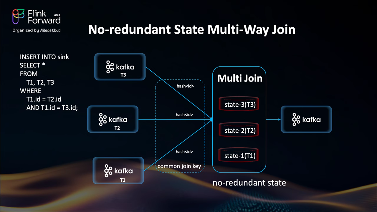 它允许使用同一个关联键,在单个算子内同时关联多条流。不同于级联式的二元 Join,Multi-Way Join 为每条输入流维护一个独立的索引状态表,不再生成中间 Join 结果,也无需嵌套存储。