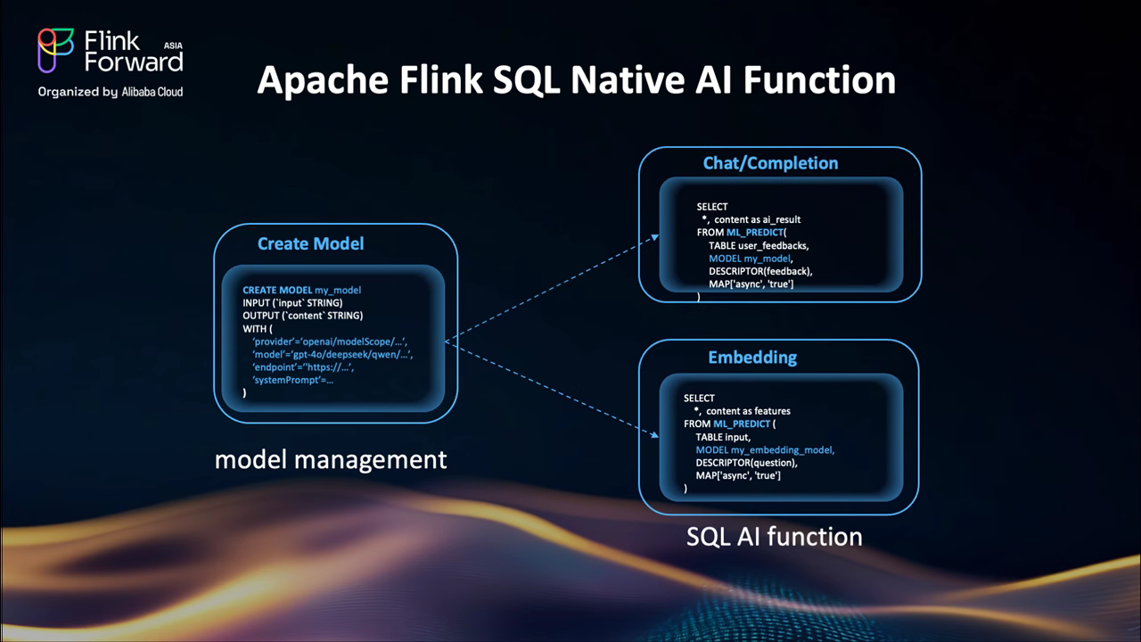 - Flink SQL 融合 AI:让数据与智能无缝集成 原生支持模型管理与 AI 函数,让 AI 流水线在 SQL 中更统一、更易用; 新增