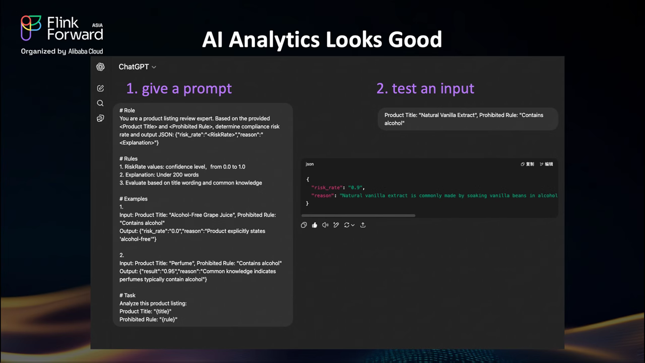 当像"天然香草提取物"这样的产品标题到达时,Flink 通过ML_PREDICT函数将其发送到AI模型。这是一个异步请求以确保高吞吐量。模型分析它并返回 JSON 响应。