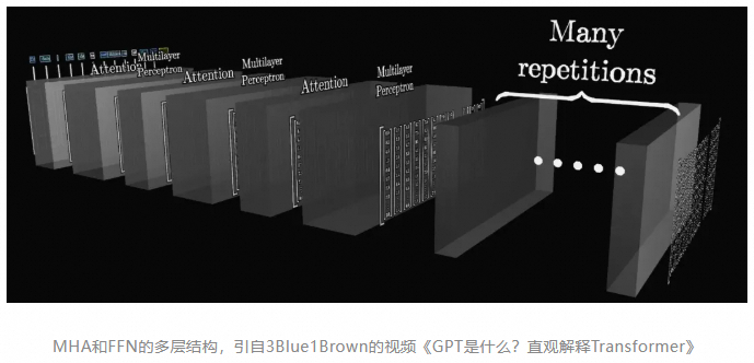 隐藏层不只有一层,而是一种多层嵌套的结构。如上图,Attention是MHA,Multilayer Perceptron(MLP)是FFN,它们就像奥利奥饼干一样彼此交错。这是为了通过建立更深的网络结构,帮助模型在不同的抽象层次上捕捉序列内部的依赖关系,最终将整段文字的所有关键含义,以某种方式充分融合到最后的输出中。隐藏层的层数并不是越多越好,这取决于模型的设计,可以参考前文贴过的模型参数表,其中的L就代表该模型的隐藏层的层数。较新的Qwen2-72B有80层,GPT-4有120层。