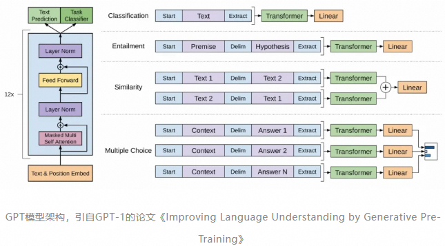 上图来自于GPT-1的论文,图片左侧是GPT涉及到的核心组件,这是本文的重点内容。图片右侧是针对不同NLP任务的输入格式,这些格式是为了将各种任务的输入数据转换为Transformer模型能够处理的序列形式,用于模型与训练的过程。