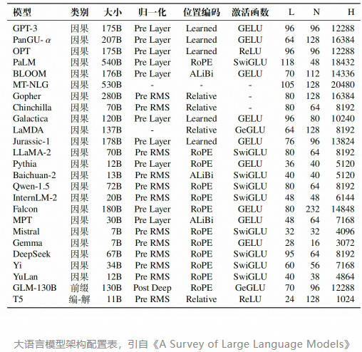 这些架构在当今的大语言模型阶段都有应用,其中因果解码器架构是目前的主流架构,包括Qwen-2.5在内的众多模型采用的都是这种架构。具体可以参考下面的大语言模型架构配置图,其中类别代表架构,L 表示隐藏层层数,N 表示注意力头数,H 表示隐藏状态的大小。