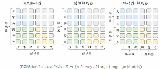 单向注意力和双向注意力,有各自的优势,例如,对于文本生成任务,可能会优先考虑单向注意力以保持生成的连贯性。而对于需要全面理解文本的任务,可能会选择双向注意力以获取更丰富的上下文信息。如上图分别是编码器架构(BERT)、编码器-解码器架构(T5)、因果解码器架构(GPT)、前缀解码器架构(T5、GLM)的注意力模式。