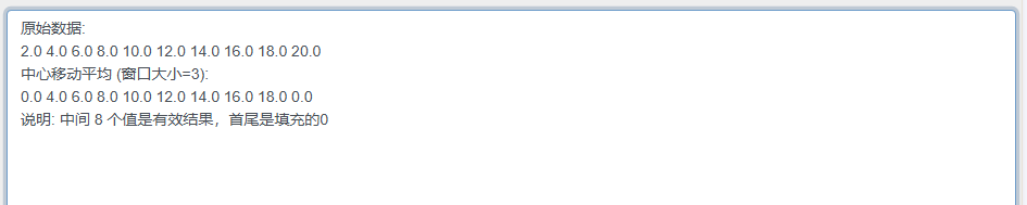 平滑后的数据为:[4, 6, 8],但请注意,这些值分别对应原始数据的第2、3、4个位置,首尾各损失一个点。