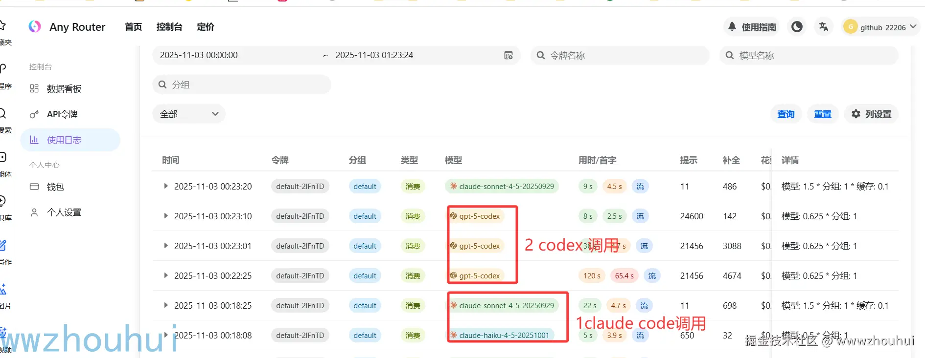 我们查看下模型调用情况,我们发现后端日志记录分别是2个工具的调用。实现了文章前面提到的Claude Code + Codex 的协同开发模式