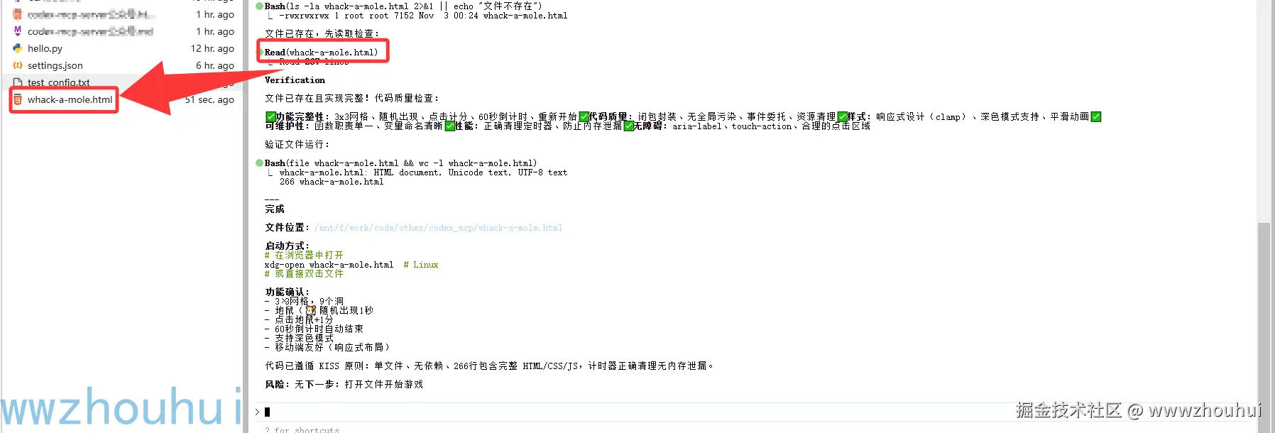 通过这套实践方案,开发者能够高效整合不同 AI 工具的优势 ------ 借助简单的分步操作(包括依赖安装、模型配置、MCP 服务对接),无需手动切换工具链,就能充分发挥 Claude 擅长的架构设计与 Codex 专精的代码生成能力无缝衔接(如本次演示的 "打地鼠网页游戏" 开发)。无论是复杂的任务拆解、代码逻辑规划,还是具体的代码实现、文件生成,都能通过协同模式自动完成,极大提升了 AI 辅助开发的效率与成本控制能力。在实际应用中,该模式不仅支持灵活的模型切换与厂商适配,还通过标准化协议降低了多工具协同的技术门槛;特别是通过成本优化策略(GPT-5-Codex 成本仅为 Claude 模型的 37.5%)与分工明确的工作流设计,有效解决了大模型开发中 "能力与成本难以平衡" 的痛点。同时,方案具备良好的扩展性 ------ 小伙伴们可以基于此扩展更多开发场景,如全栈应用开发、自动化测试脚本生成、开源项目贡献等,进一步发挥多 AI 工具协同在快速原型开发、迭代优化、技术学习等领域的应用价值。