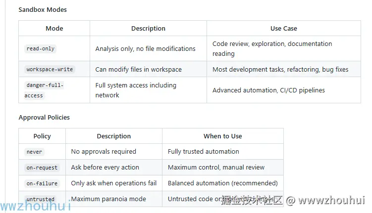 其中重点是approval_policy 和sandbox_mode 的设置。大家可以参考我这个就行了。关于详细的sandbox_mode 和approval_policy 哪些属性打开可以看