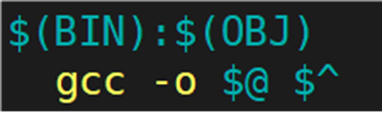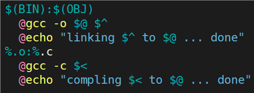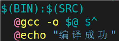 之前将 .c 文件编译成 .o 文件时,指令为:gcc -c src.c -o src.o,其实指令还可以写成:gcc -c src.c,编译器会自动形成同名的 .o 文件。所以 %.o:%.c 的依赖方法可以写成:gcc -c \<。** **< 表示对展开的依赖 .c 文件,一个一个的交给编译器。