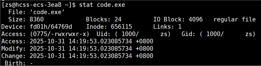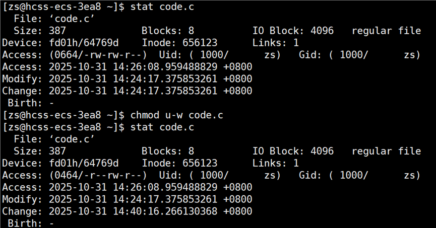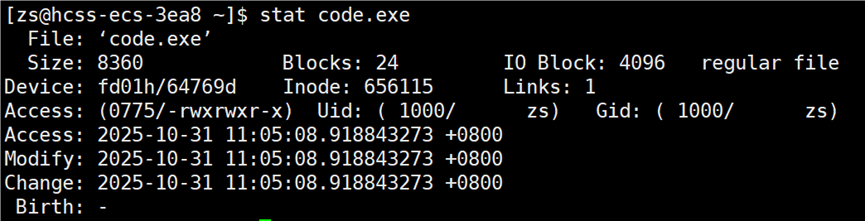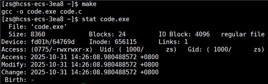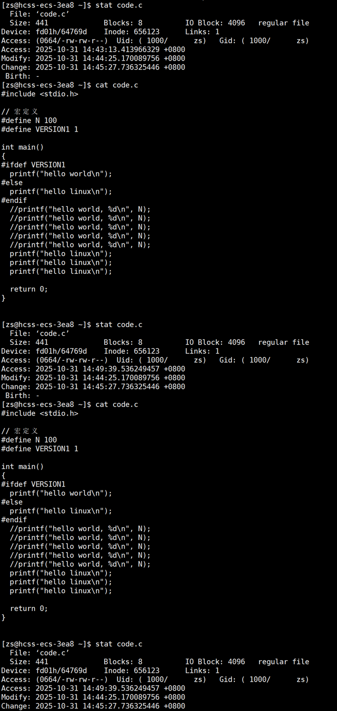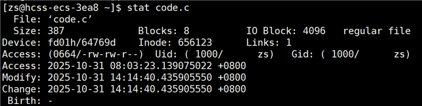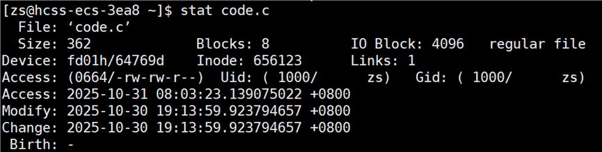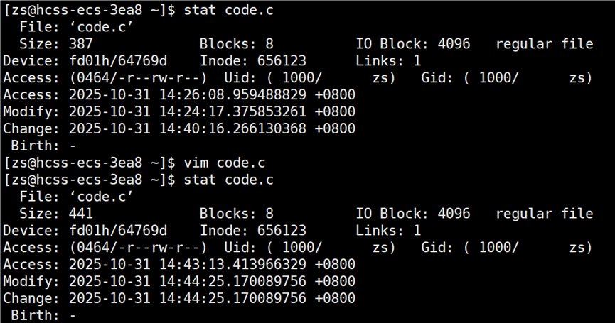 接下来打开 code.c 文件,修改文件中内容(增或删),再次查看 code.c 的时间。