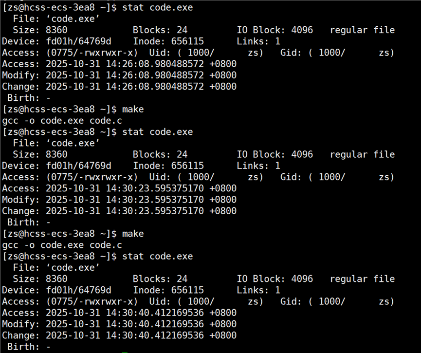 现在源文件的 modify 时间又比可执行程序的 modify 时间更新,允许再次编译源文件