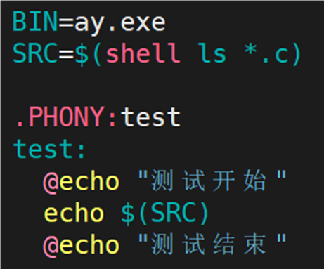 为了更好的理解 @ 和 ^,将 Makefile 文件中的内容更改成下图所示,便于看到命令的回显: