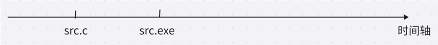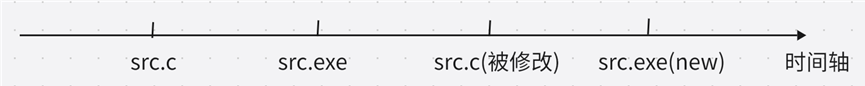 因为先有的源文件,再有的可执行程序,所以可执行程序的 modify 时间一定比源文件的 modify 时间更新。在时间轴上的表示情况如下所示: