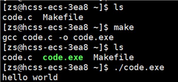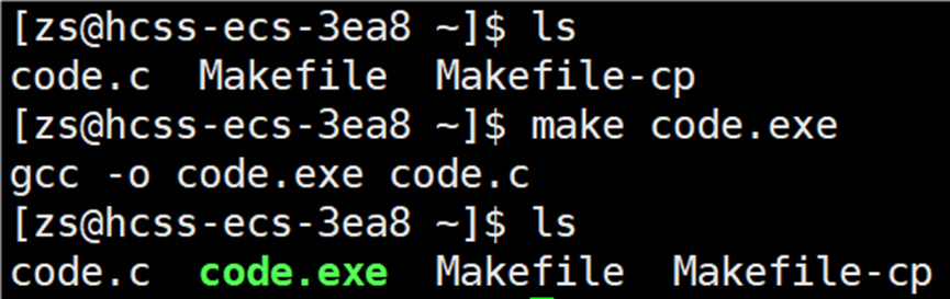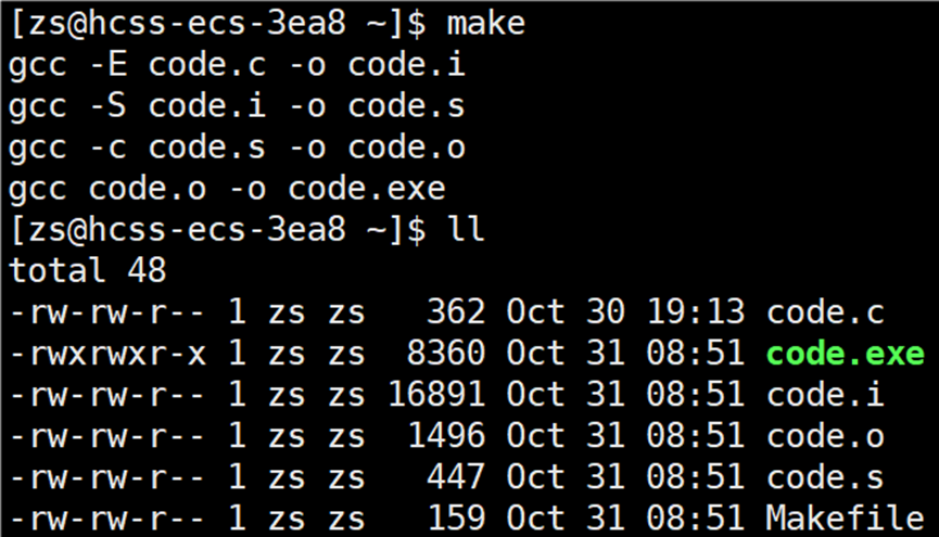 输入 make 指令后,自动执行 Makeflie 中的内容,并且自动帮助我们生成 code.exe 文件。所以说make 是个命令,makefile 是个文件。