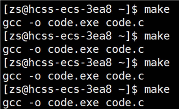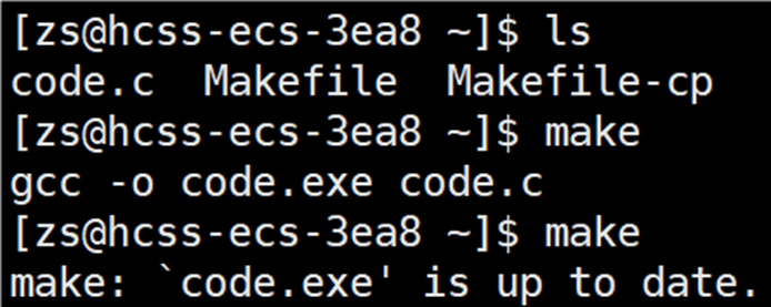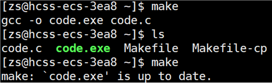 当连续输入 make 命令时,命令行会显示 code.exe 已经是最新的。