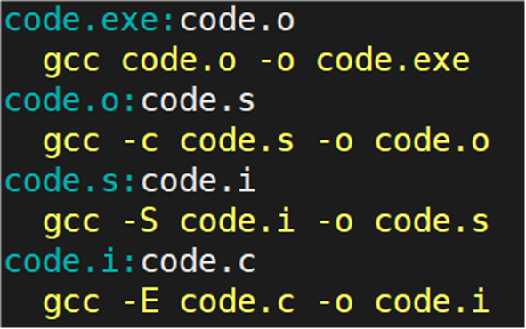 要生成 code.exe 文件,就需要依赖文件 code.o,code.o 文件在当前路径下没有,再往下找是否是依赖文件列表生成的目标文件,按照此道理类推,直到找到 code.i:code.c。code.c 在当前路径下存在,所以生成 code.i 目标文件