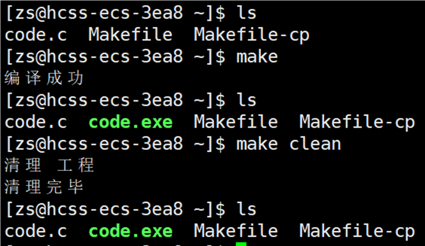 由上图可以知道,clean 确实将生成的可执行文件给删除了,这样就简单的完成了 makefile 的构建和清理过程。