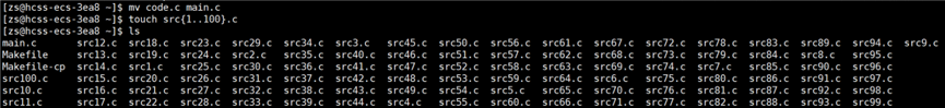 之前操作的都是一个源文件,如果有多个源文件呢?将 code.c 重命名为 main.c ,创建100个源文件,如何创建100个以 .c 结尾源文件,方法:touch xxx{1..100}.c,如下图所示: