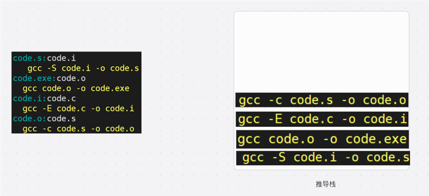 make 会解析 Makefile 中的依赖关系和依赖方法,根据依赖关系形成推导栈,推导栈就是依赖方法的集合。