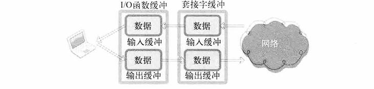从图中可以看到,使用标准/O函数传输数据时,经过2个缓冲。例如,通过fputs函数传输字符串"Hello"时,首先将数据传递到标准/O函数的缓冲。然后数据将移动到套接字输出缓冲,最后将字符串发送到对方主机。