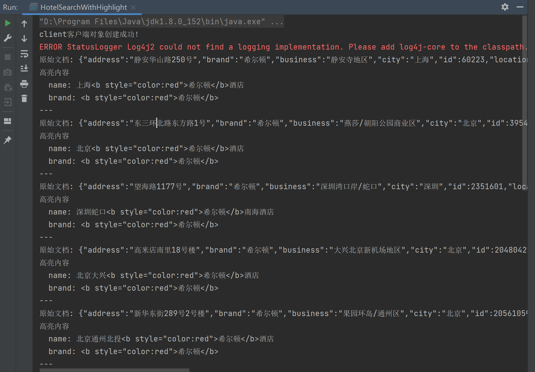 Java 代码示例:搜索酒店名称或品牌中包含"希尔顿"的酒店,并对名称和品牌进行高亮