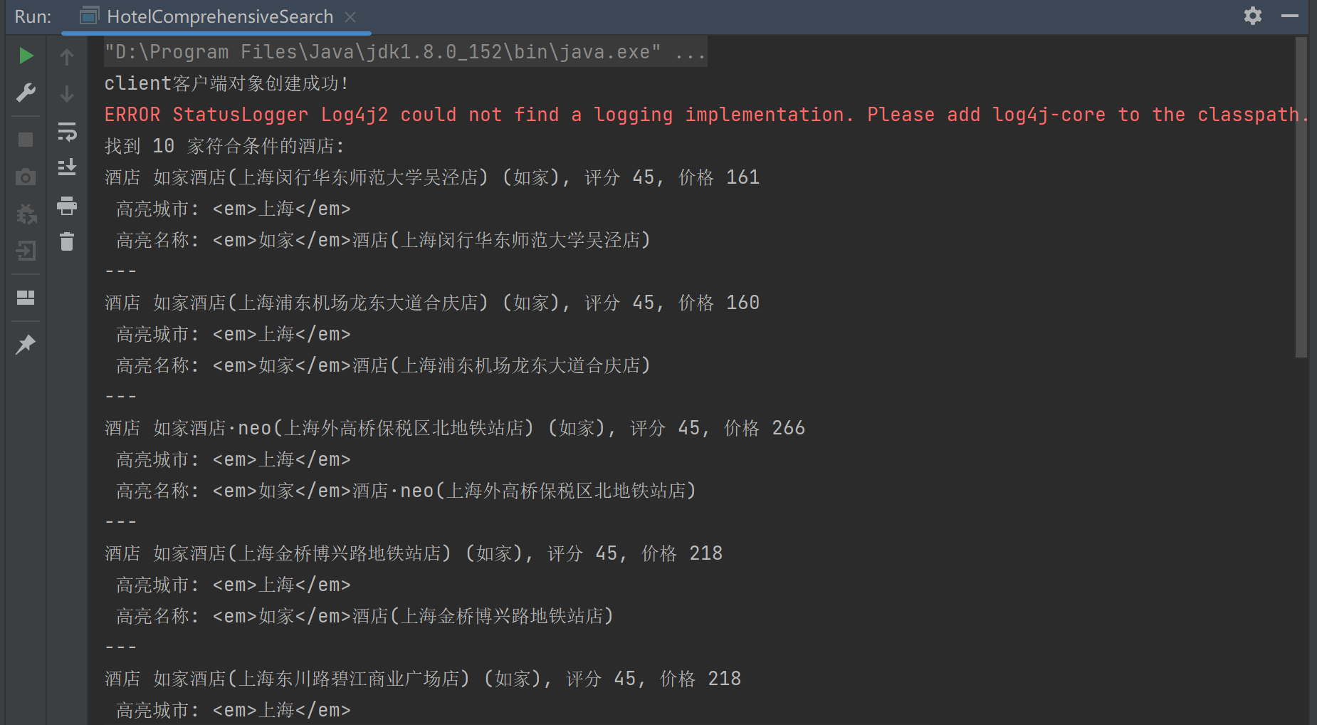 在实际项目中,我们通常需要将这些功能组合使用。下面是一个综合示例,模拟一个真实的酒店搜索场景:分页查询"上海"地区且商圈包含"陆家嘴"的酒店,按评分降序排列,并对酒店名称和商圈进行高亮。
