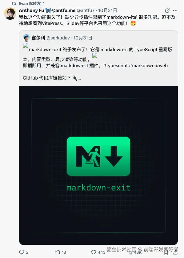 Vue 团队成员真的是太卷了,又搞了个新玩具:markdown-exit------markdown-it 的 TypeScript「重构版」来了!