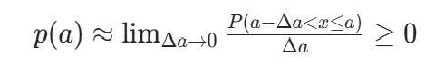 连续型随机变量x的基本特性是它的分布或概率密度函数(Probability density function,PDF),通常记为p(x)。连续型随机变量在x=a处的概率密度函数定义为