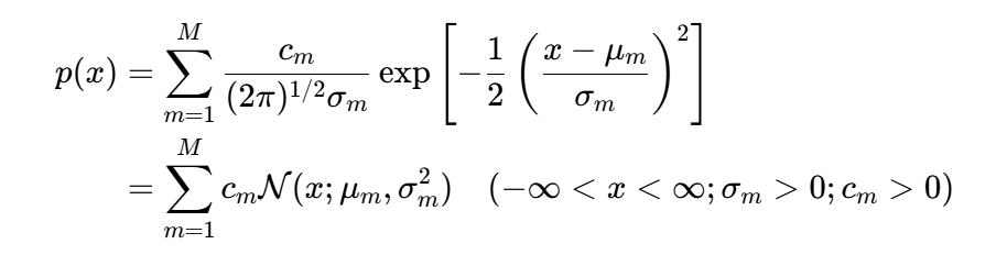 现在我们来讨论一种服从混合高斯模型(Gaussian Mixture Model, GMM)的混合高斯随机变量。一个标量连续随机变量x服从混合高斯分布,如果它的概率密度函数为
