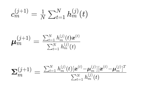 计算得到的后验概率,t=1,...,N(这里N是采样率)。给定这些后验概率值后,每个高斯成分的先验概率、均值和协方差都可以根据公式计算,这些公式本质上是整个采样数据的加权平均的均值和协方差。