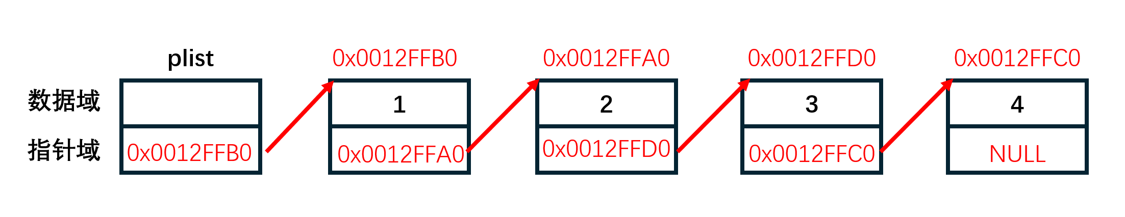图中指针变量 plist保存的是第一个结点的地址,我们称plist此时"指向"第一个结点,如果我们希望plist"指向"第二个结点时,只需要修改plist保存的内容为0x0012FFA0。
