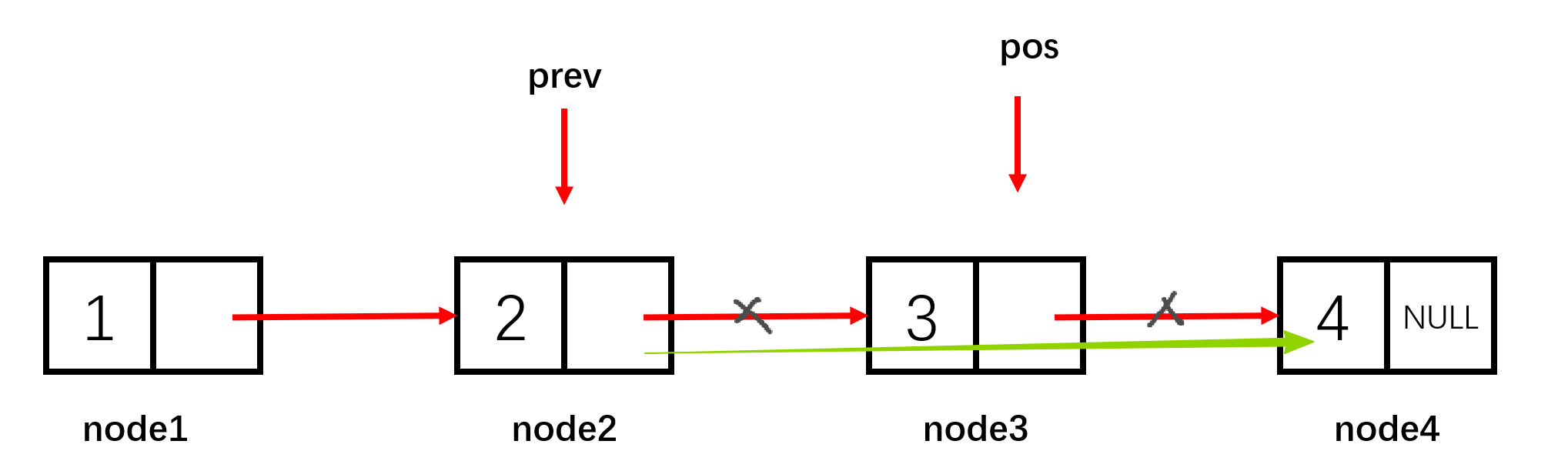 prev->next = pos->next;
