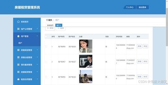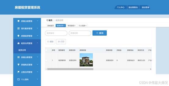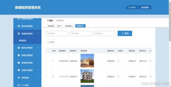 图5.3展示的就是房屋租赁管理界面,这个界面是用来由管理者控制和维护房屋租赁信息的地方,该界面的核心目的是提供房屋租赁的管理