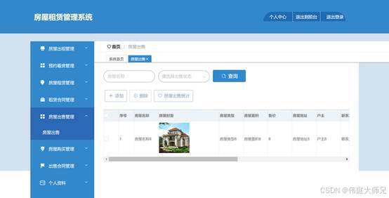图5.6展示的是房屋出售管理界面,这个界面是用来控制和维护房屋出售信息的地方,该界面的核心目的是提供房屋出售信息的管理