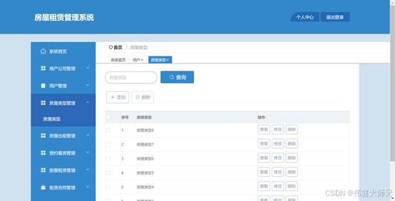 图5.2展示的是房屋类型管理界面,这个界面是用来由管理者控制和维护房屋类型的地方,该界面的核心目的是提供房屋类型的管理