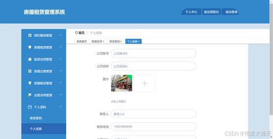 图5.4展示的是个人信息页面,此页面可以对自己的账号信息进行修改,包括公司名称、图片、联系人,地址等