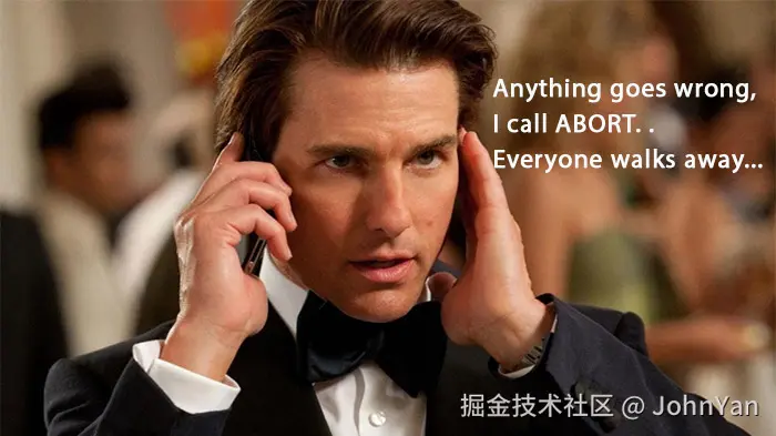 在本文成文过程和提及Abort这个话题的时候,笔者脑海中老是出现战争和动作电影中,主人公遇到不利情况下,大呼"Abort Misson!!"的场景,很有既视感。