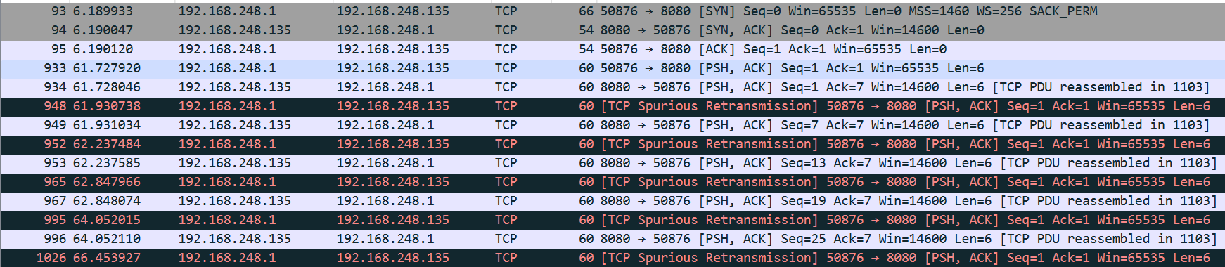 失败了,客户端没有收到服务端的PSH+ACK包,导致一直重发