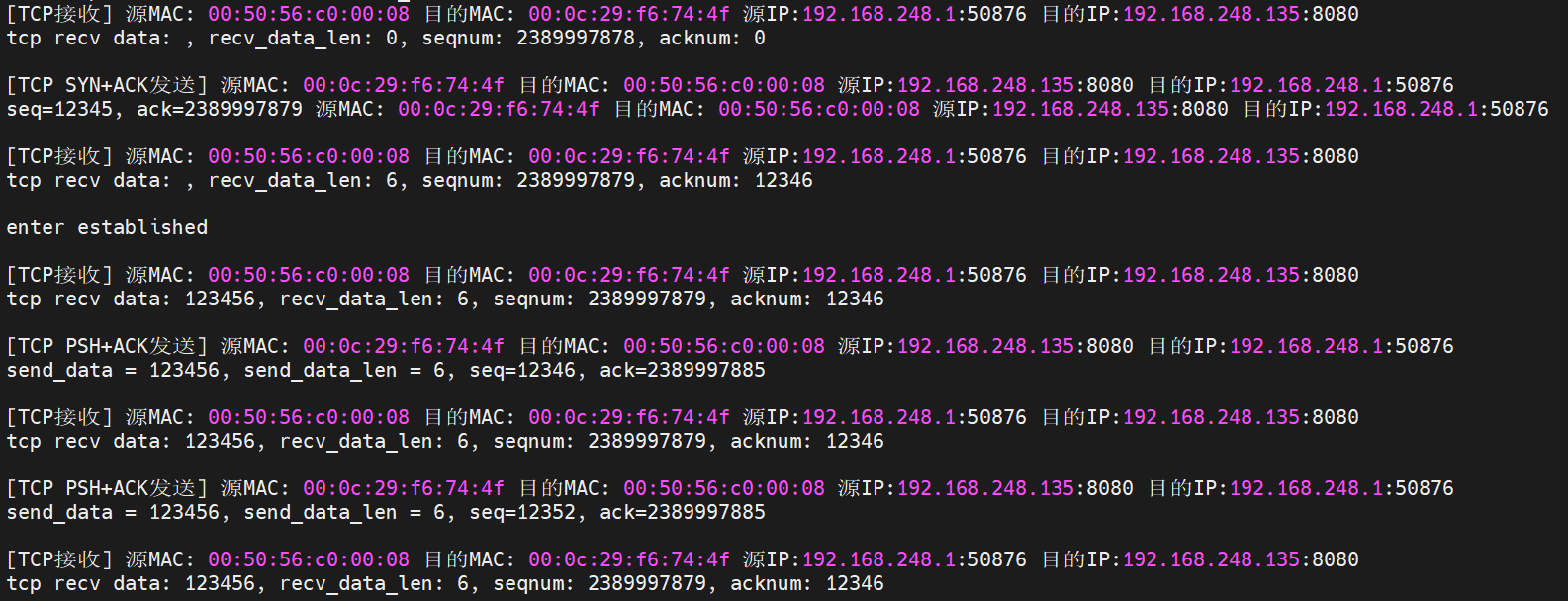 // TCP数据回复(带数据)发送前打印MAC、IP、端口