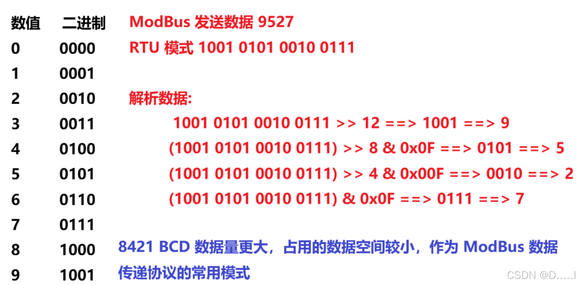 以上代码实现了十进制数与 8421 BCD 码之间的相互转换。在 ModBus RTU 通信中,你可以根据实际需求使用这些函数对数据进行编码和解码。